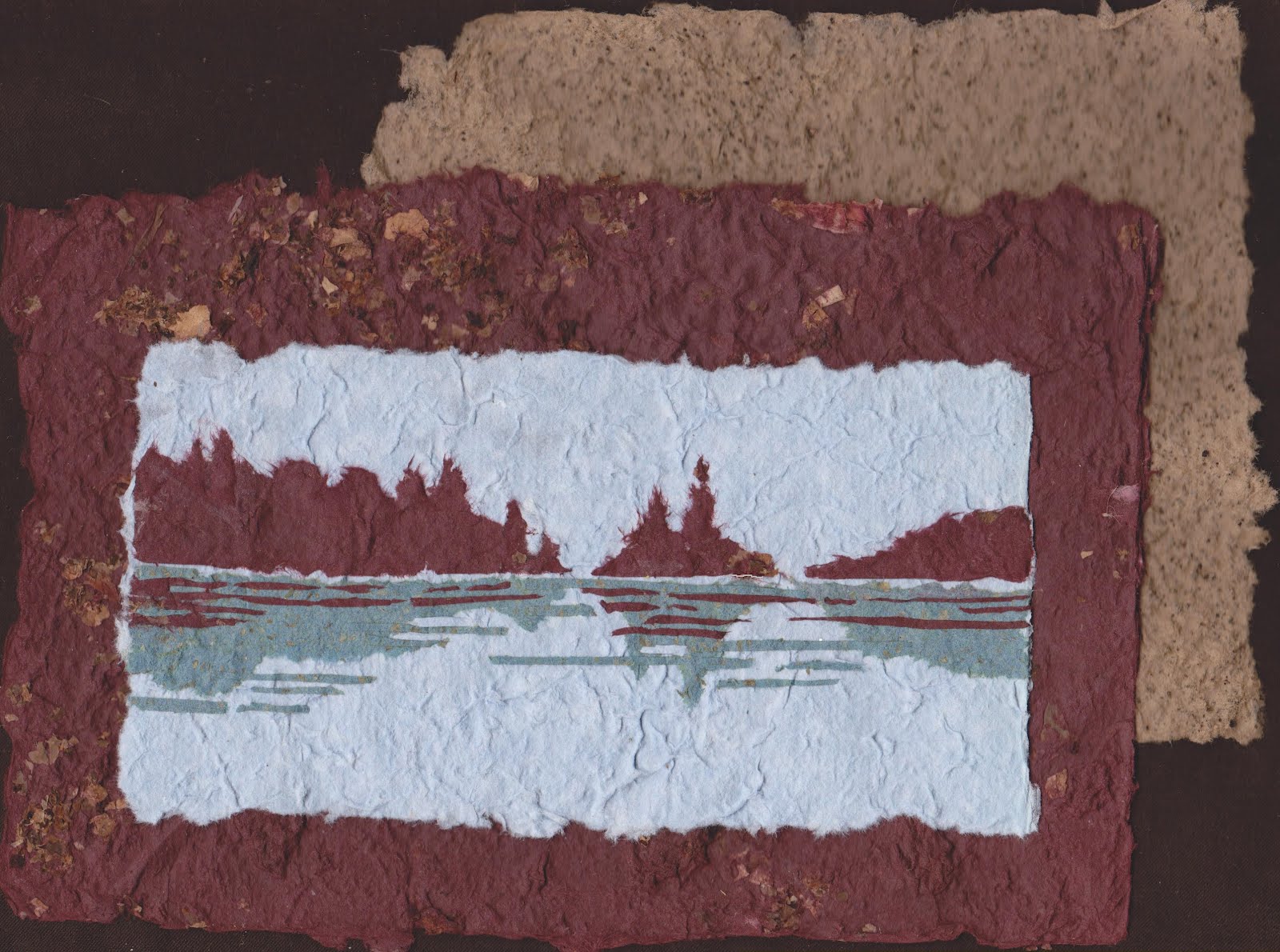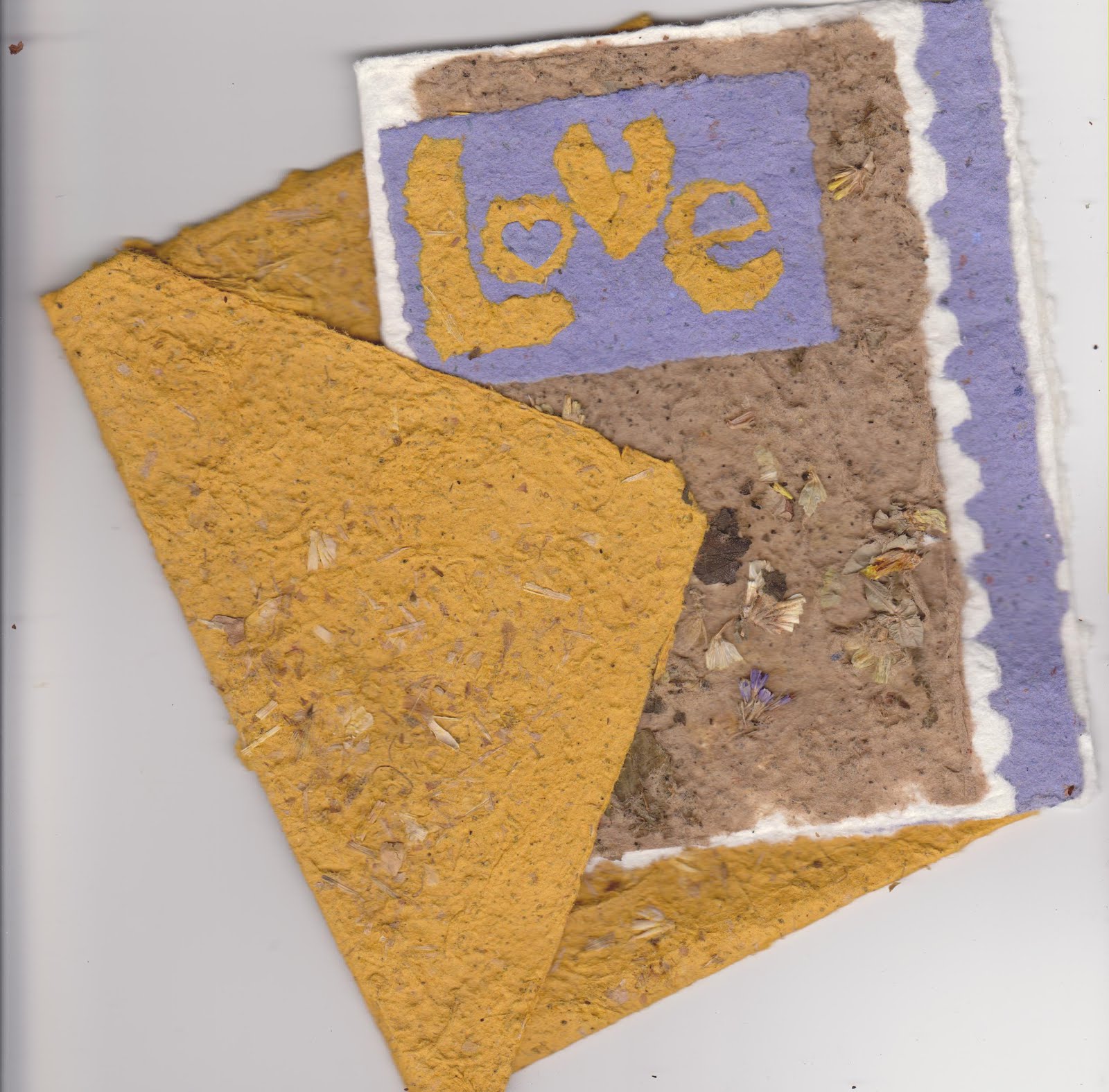 I am still lacking a camera to capture the journey, still squishing samples and projects into my overloaded scanner so as to share in the projects and pieces that i hope will illustrate the practical and whimsical uses of the papers we will create. First up is a note card and envelope. ( Until my recipe is fortified with something that would imbue the product with properties suited to surviving Canada Post, these gems would be perhaps best suited to “in person” giving, )