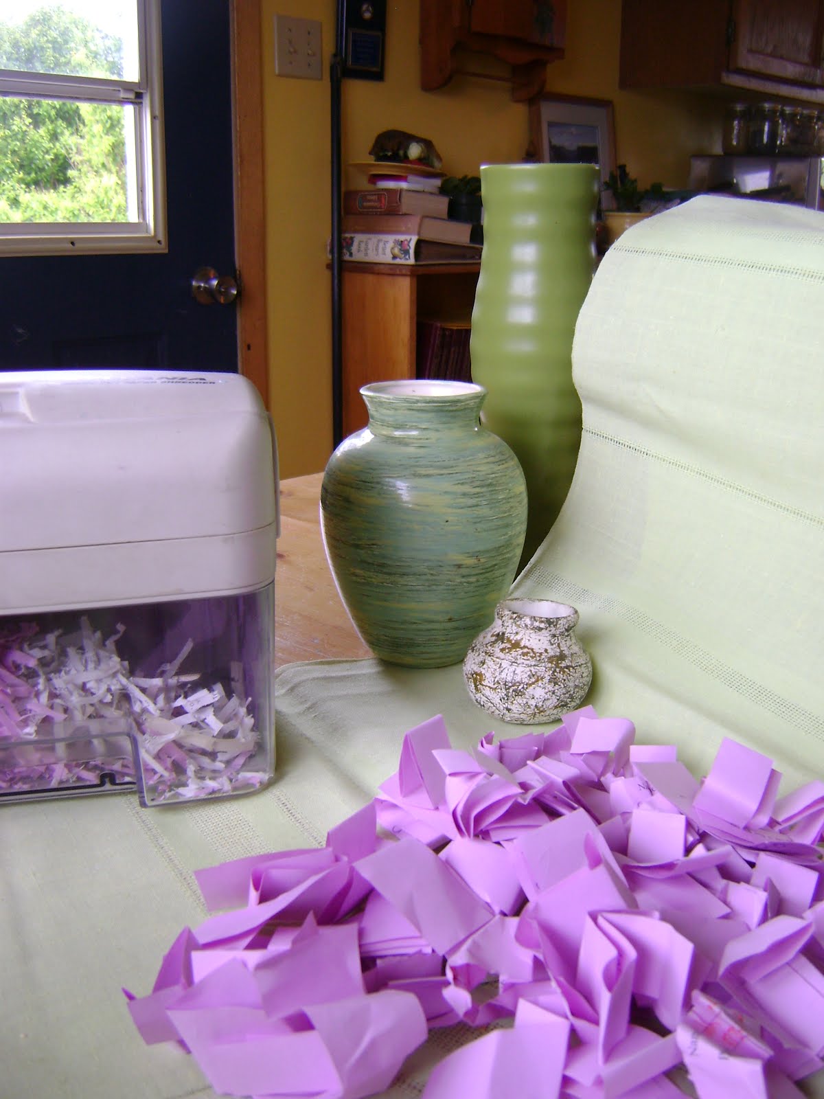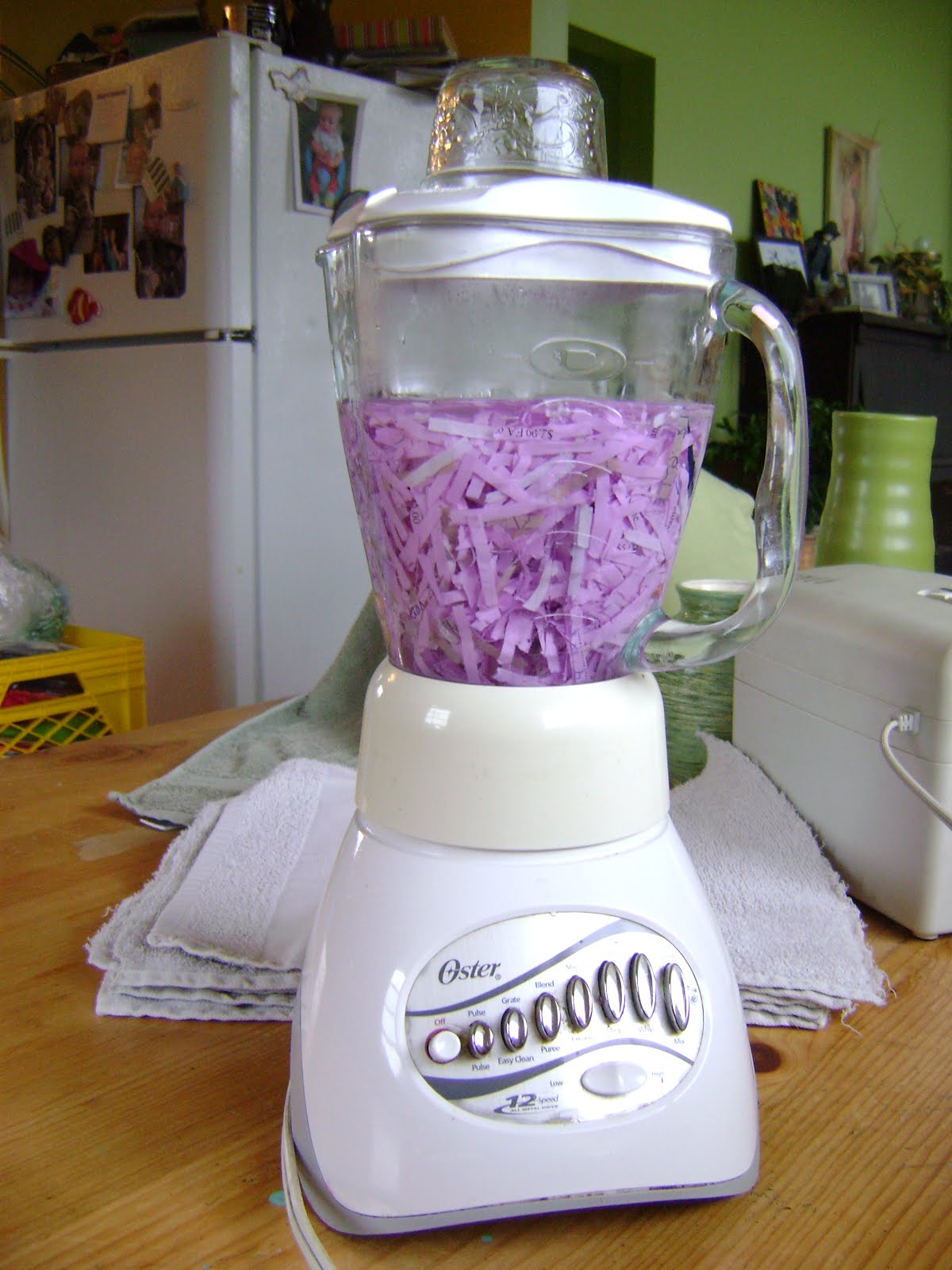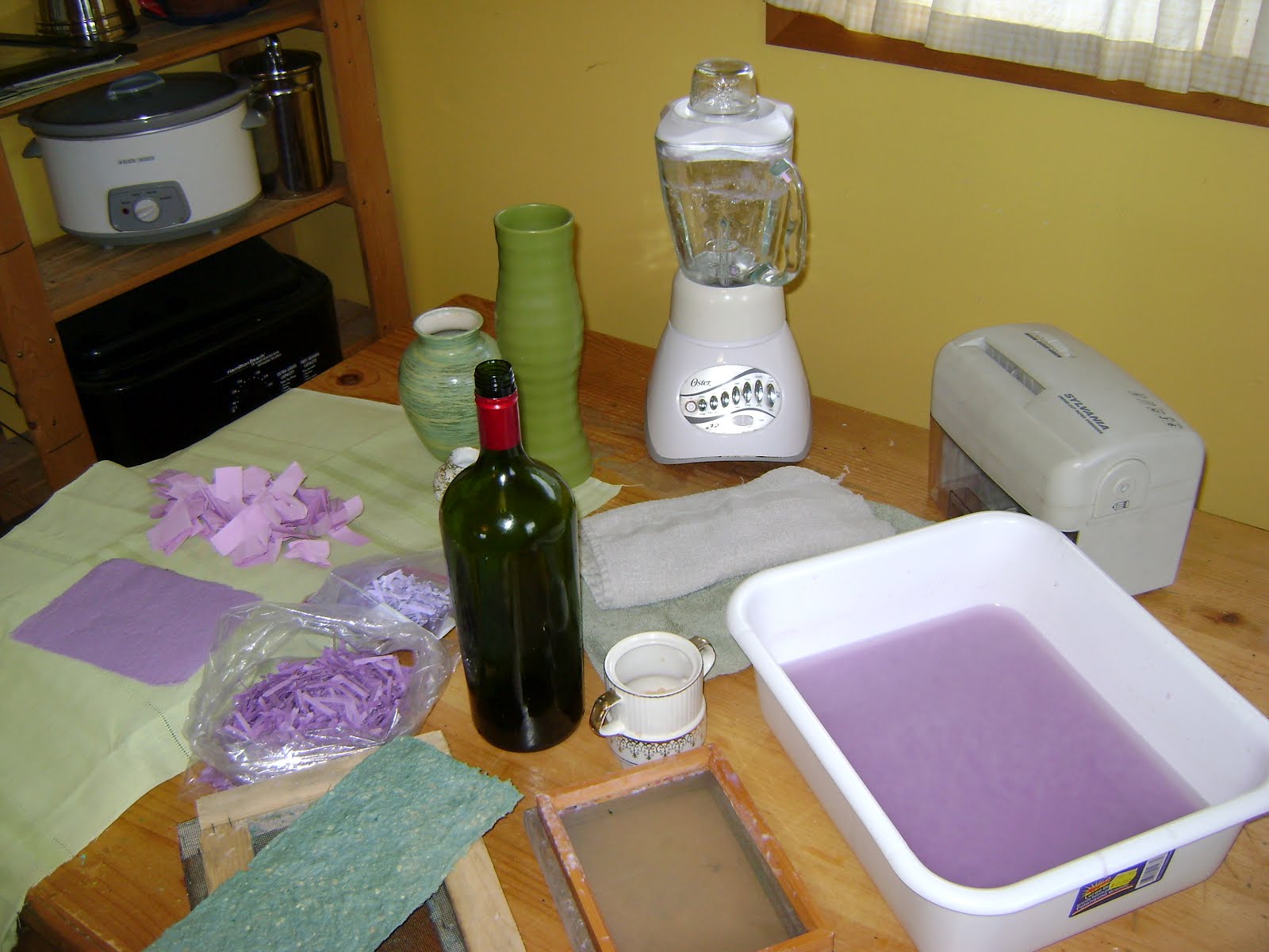 The Eco-purists list of tools needed would be some screen or mesh, a rolling pin or an empty wine bottle. ( or even better, a full one, then you can celebrate when the spirit moves you. ). To save time and labor I did use a paper shredder and a blender proves most useful. Also needed, lots of containers, tubs, basins or sinks.