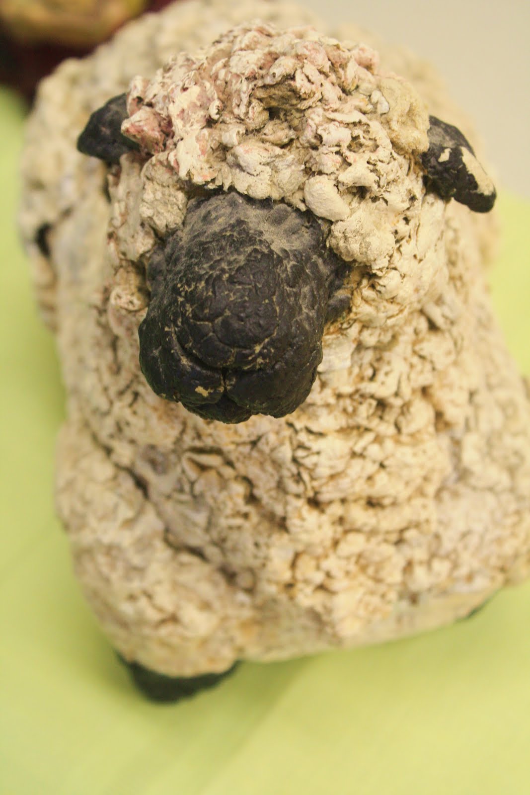 Some simpler pieces, like the sheep below, were just a few steps. Though it was some time ago, I remember schmucking a layer of mash on two upside down bread pans, adding legs in the first step to one of them and leaving a neck hole in the other. Slow drying both in a low oven. Sticking the two together and drying it again. The head was originally made to come off because he was a Sunday school collection jar. Adults thought it was morose but the kids thought it was hilarious. He’s as old as the hills but i couldn’t resist including him.