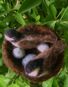 At the expense of my garden full of weeds and my house knee-deep in dog hair and dust. I have been rooted to my work table. The orders are coming fast and furious as there have been calls from other venues as well. Last week there were a number of pieces added to the Crafter’s Room inventory. I had made nests with chickadees and their tiny eggs and they are so coveted that they are heading to five different venues. Cute, they are so cute, so guess I understand!