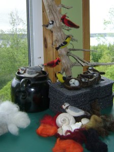 May Ogden Nash forgive my paraphrase… Spring hit the ground running, the grass is growing so fast that we can’t keep up and the birdies are emptying my feeders daily. For the last few days there have been purple and goldfinches and a beautiful male evening grosbeak added to the myriad jays, sparrows, chickadees and greedy grackles and starlings. The robins wake me and the mourning doves coo all day. A raucous pair of pheasants squawk at each other and the laughter of a northern flicker makes me smile infectiously through out my day. Inside I am perched at my work table surrounded by coloured groupings of fluff designated to replicate the feathered fancies I see just outside my open window.