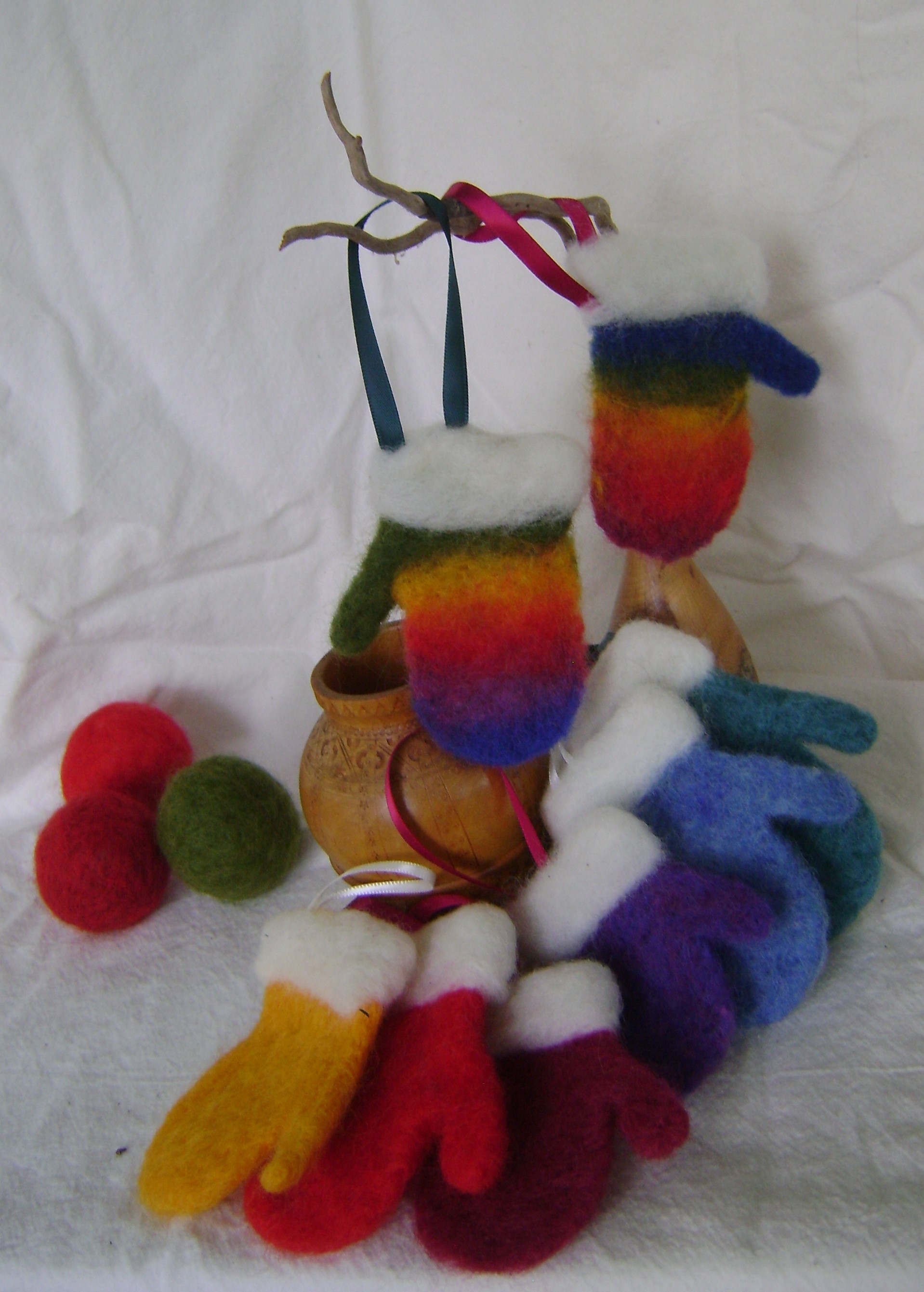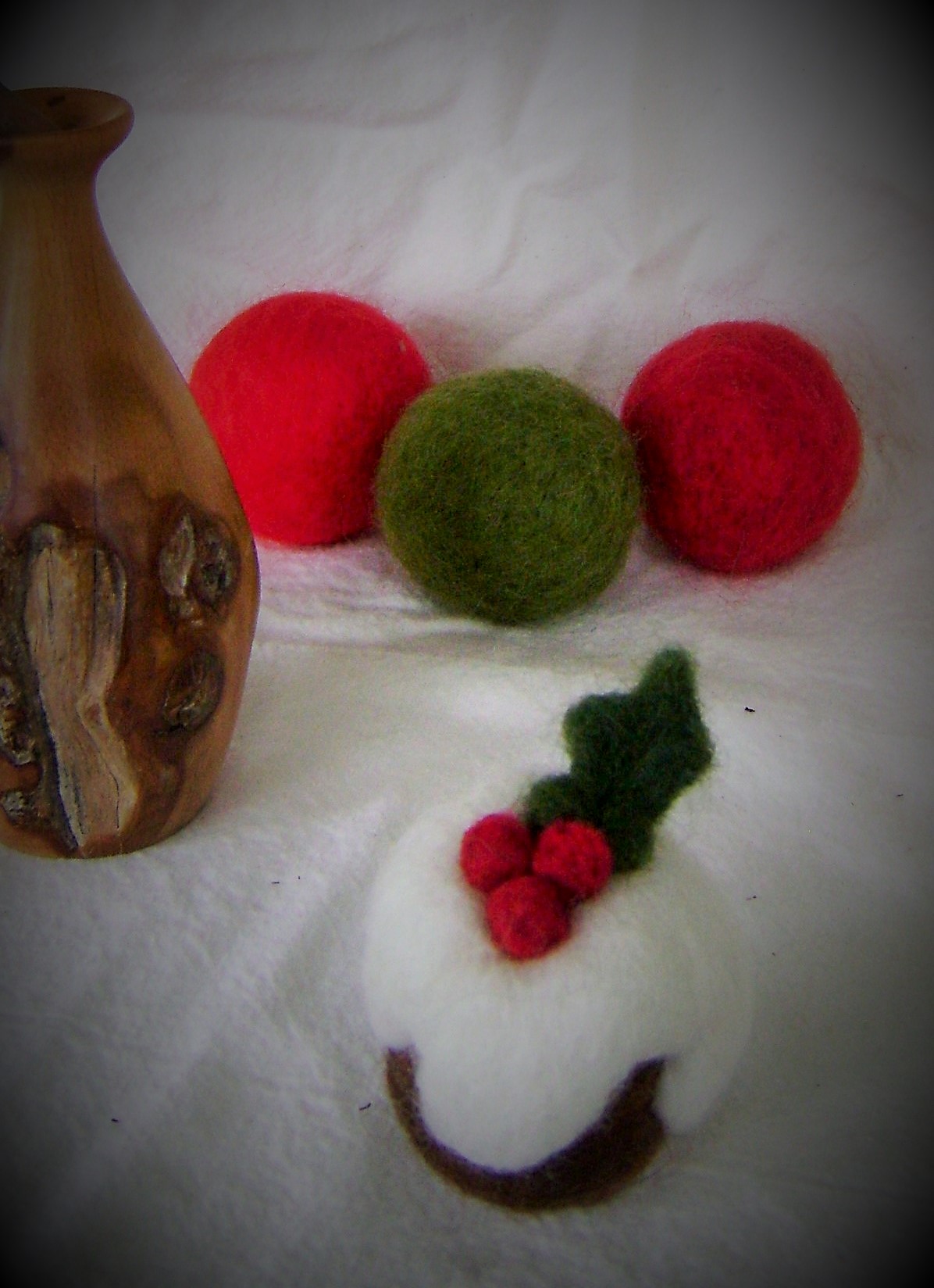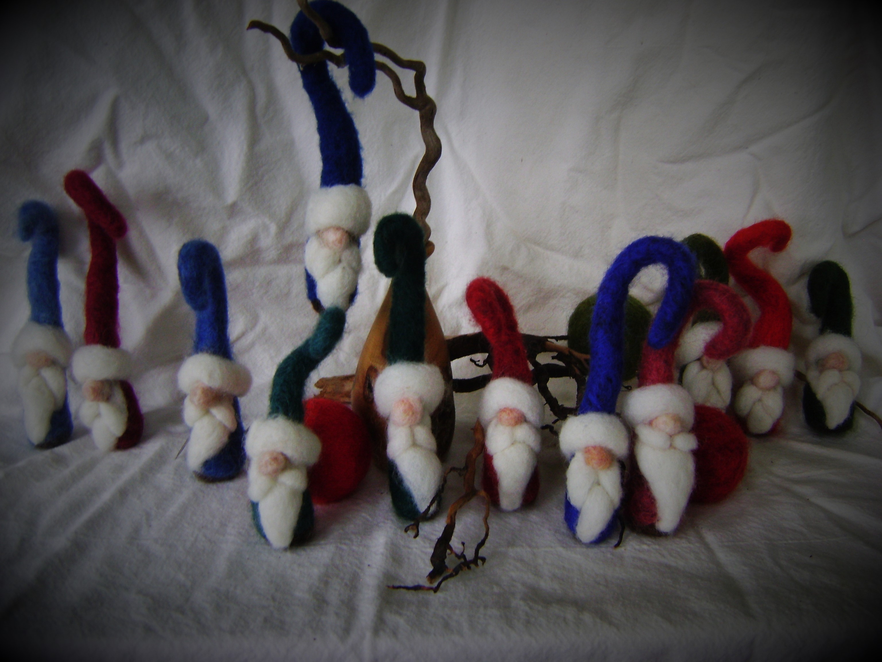 At any rate, the kind patrons who carry my work are focused with an eye on that plum pudding prize as well, so my work has begun. Fuzzy doves, and other birds, fuzzy fish, fuzzy mittens, and some new Christmas curiosities are well under way. So many images of Christmas to choose from. I did repeat some of my favorites from last year but there are others I’m dying to wrap my head ( and a little wool..) around. The gnomes have returned, I love these guys and they are already generating sales. They’re like potato chips, it seems that you can’t have just one.