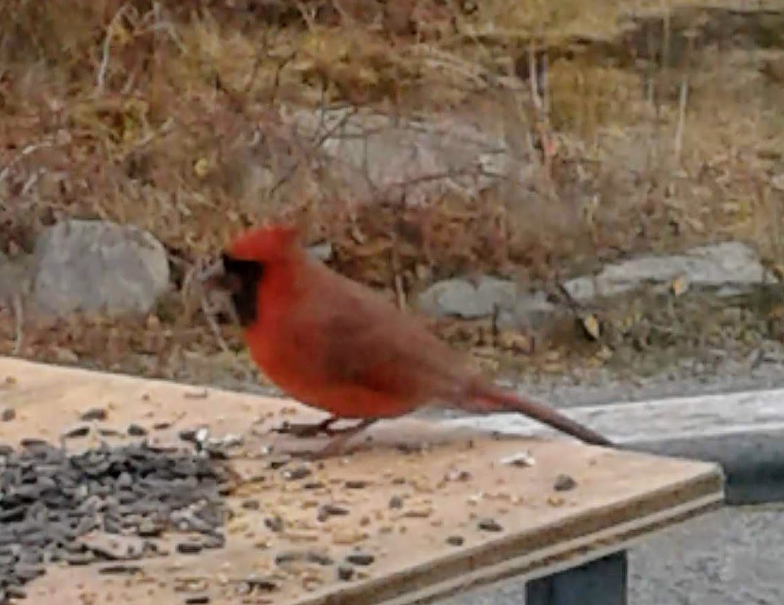 Through the years we’ve had an amazing variety of feathered friends. Never though, a Cardinal. In November 2020 a beautiful male arrived. I often wonder if one of our insane windstorms brought him here by chance. For months he stayed within hearing distance of our home. He made a habit of popping in at dawn to be the “early bird” who enjoyed all of the peanuts and sunflower seeds from the wild birdseed mix l shared daily.