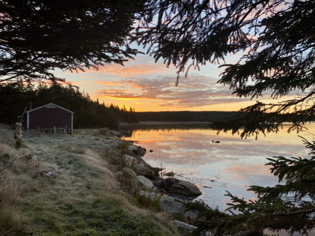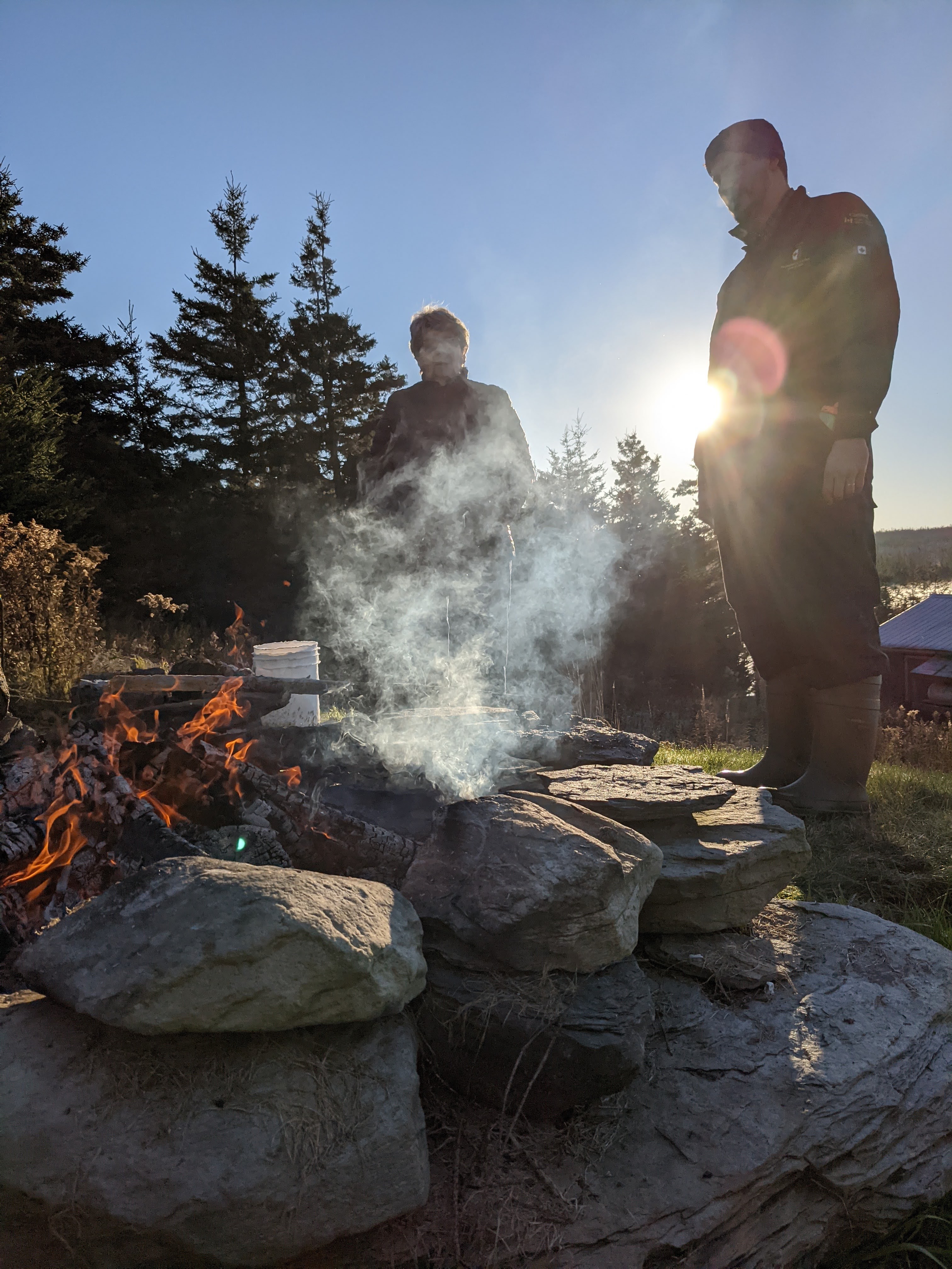 When our son, lsaac, was 7 or 8 he celebrated his May birthday in a place like no other. The cottage of his grandparents in Gegogan Harbour, Guysbourough County and pictured above. He is pictured, having morning coffee by a 6 am. campfire with godmother Donna below this past November.